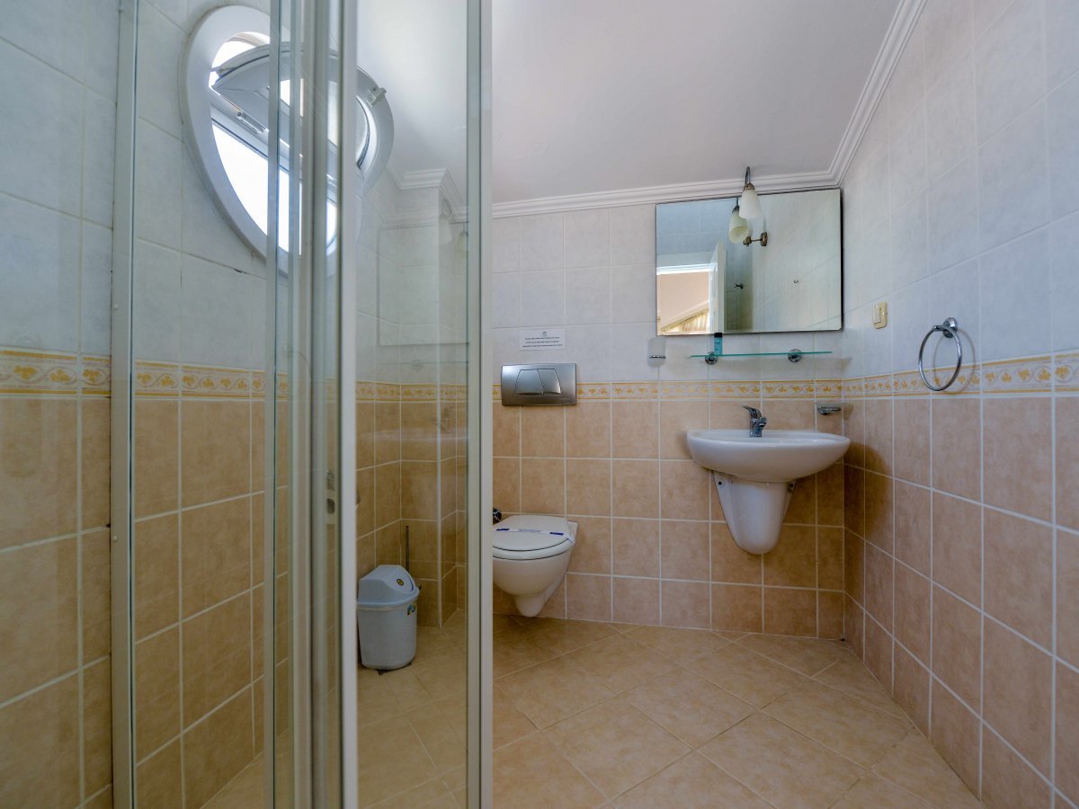 On the first floor, there are living room with open planned kitchen, communal bathroom and the bedroom.