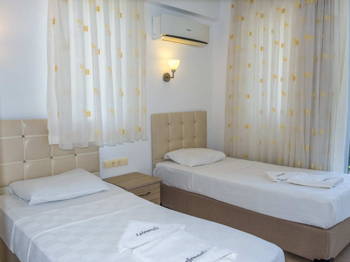 The nearest large town of Fethiye is only 4km along the coast. It takes only 10 minutes by dolmus (local bus) and 15 minutes by water-taxi. The lively market town of Fethiye with its traditional bazaar, marina, charming restaurants, great shops and night-life can be easily reached by water taxi, minibus, bike or by car. There are many boat trips from Fethiye marina to places such as The Twelve Islands; Oludeniz with its famous beach and paragliding facilities 16 km away; Gocek with its marina and market about 20 km away and the beautiful Greek Island of Rhodes 50 minutes away on hydrofoil. Other nearby attractions include Jeep safaris, horse riding, many UNESCO sites, Saklikent Gorge & the ghost town of Kayakoy to mention just a few. Diving is also popular in the Gulf of Fethiye, with the clear blue waters being home to a host of reefs, sunken ruins, wrecks as well as colourful marine life. Dalaman Airport is a 40 minute drive away and is the major airport in the area with frequent direct low-cost flights from all over Europe and Russia.