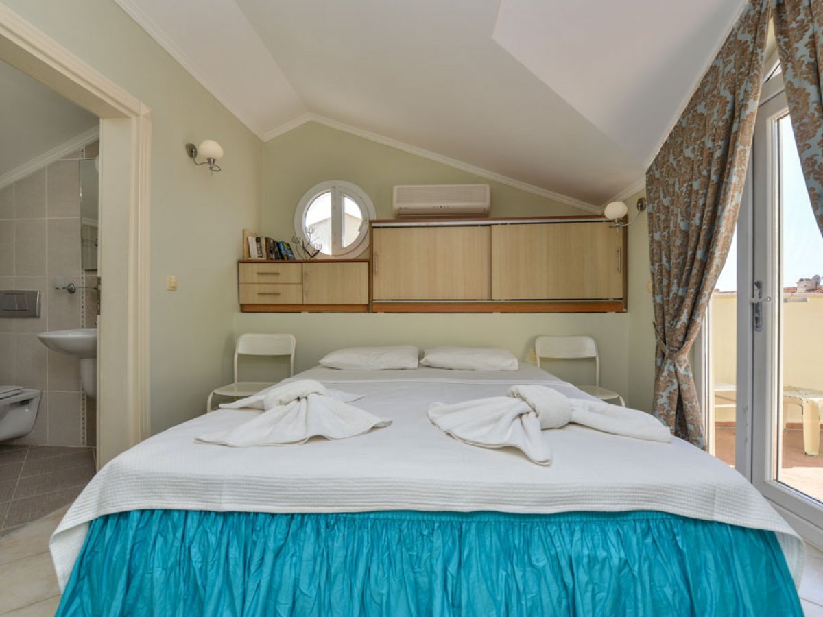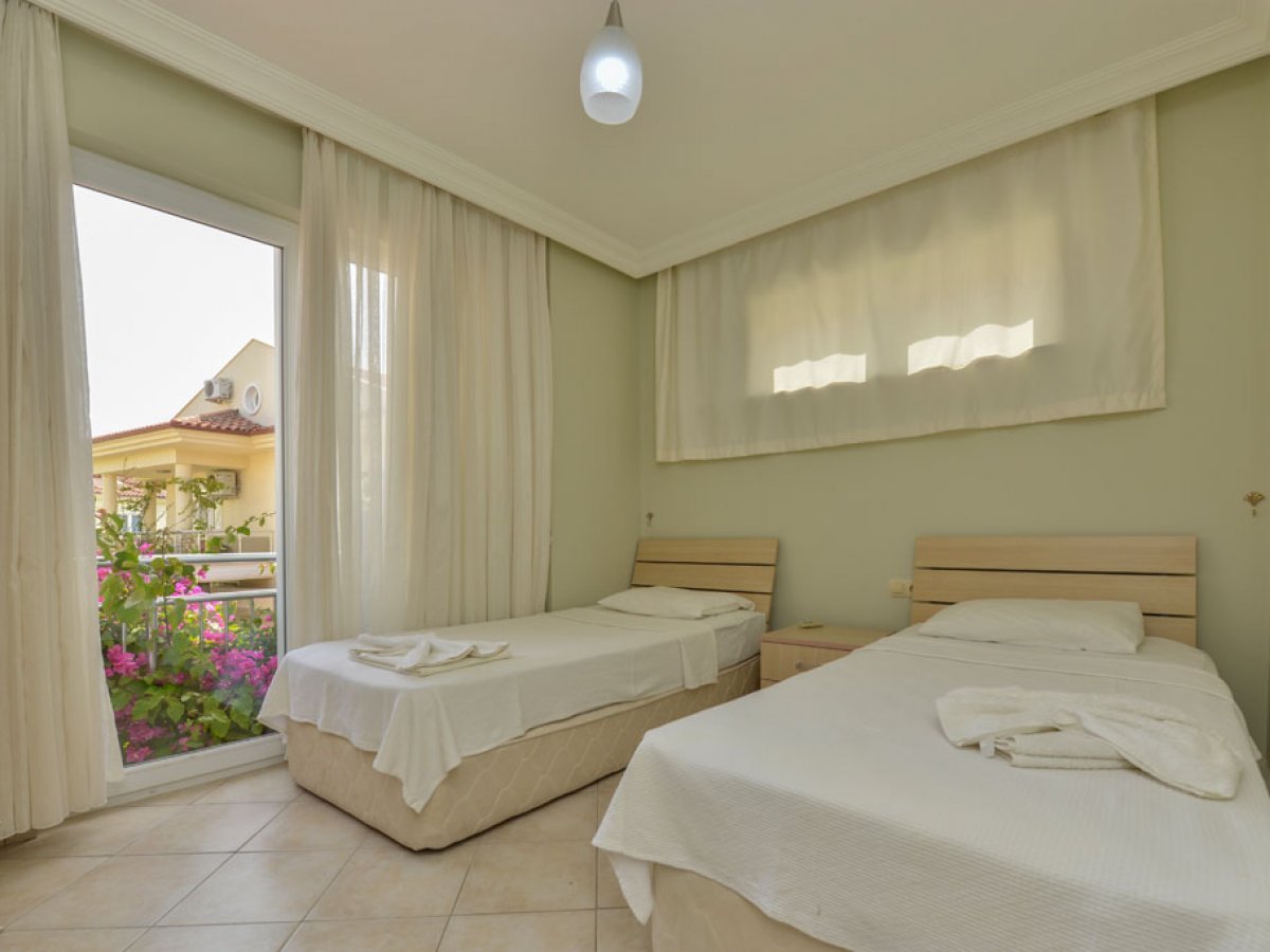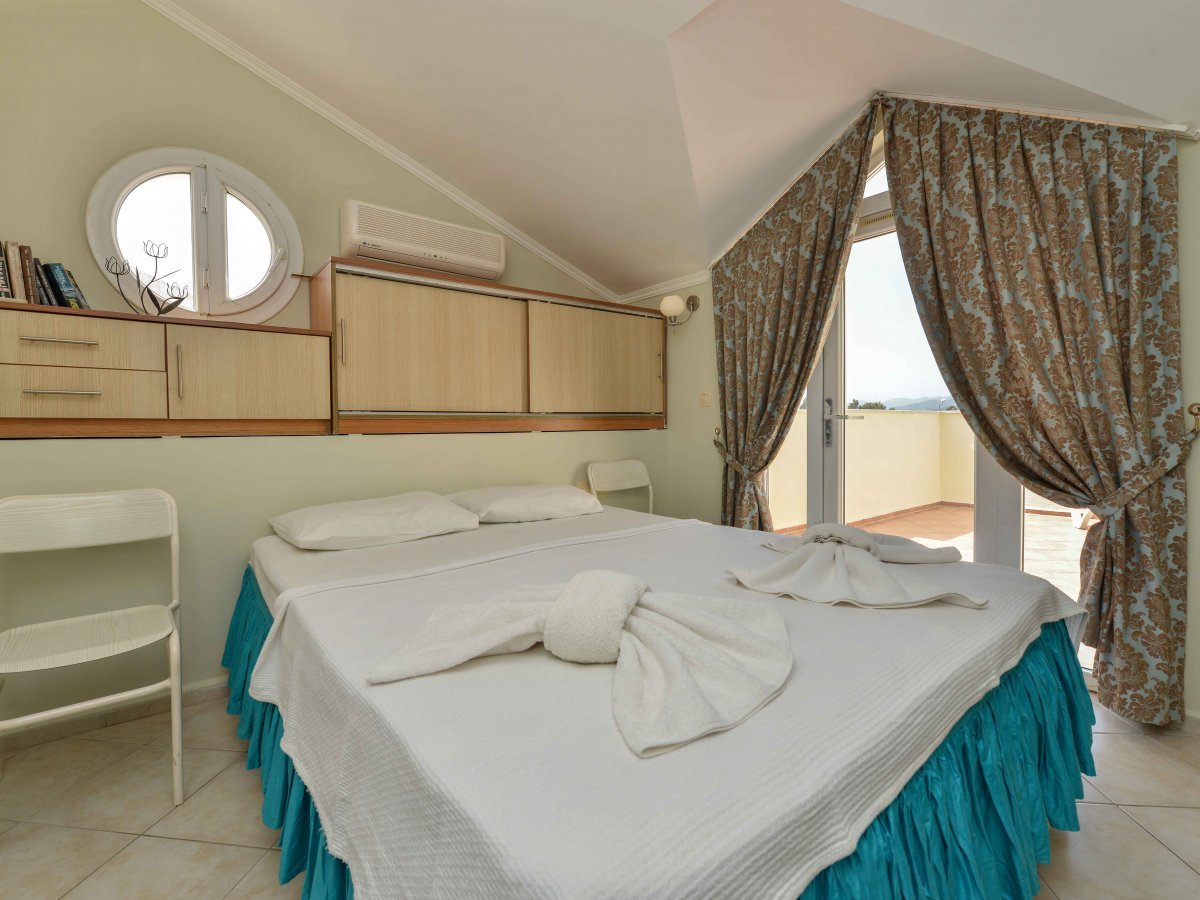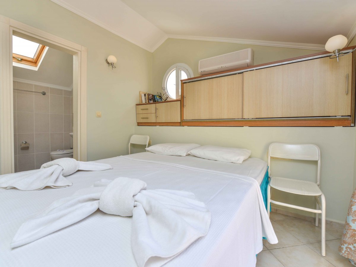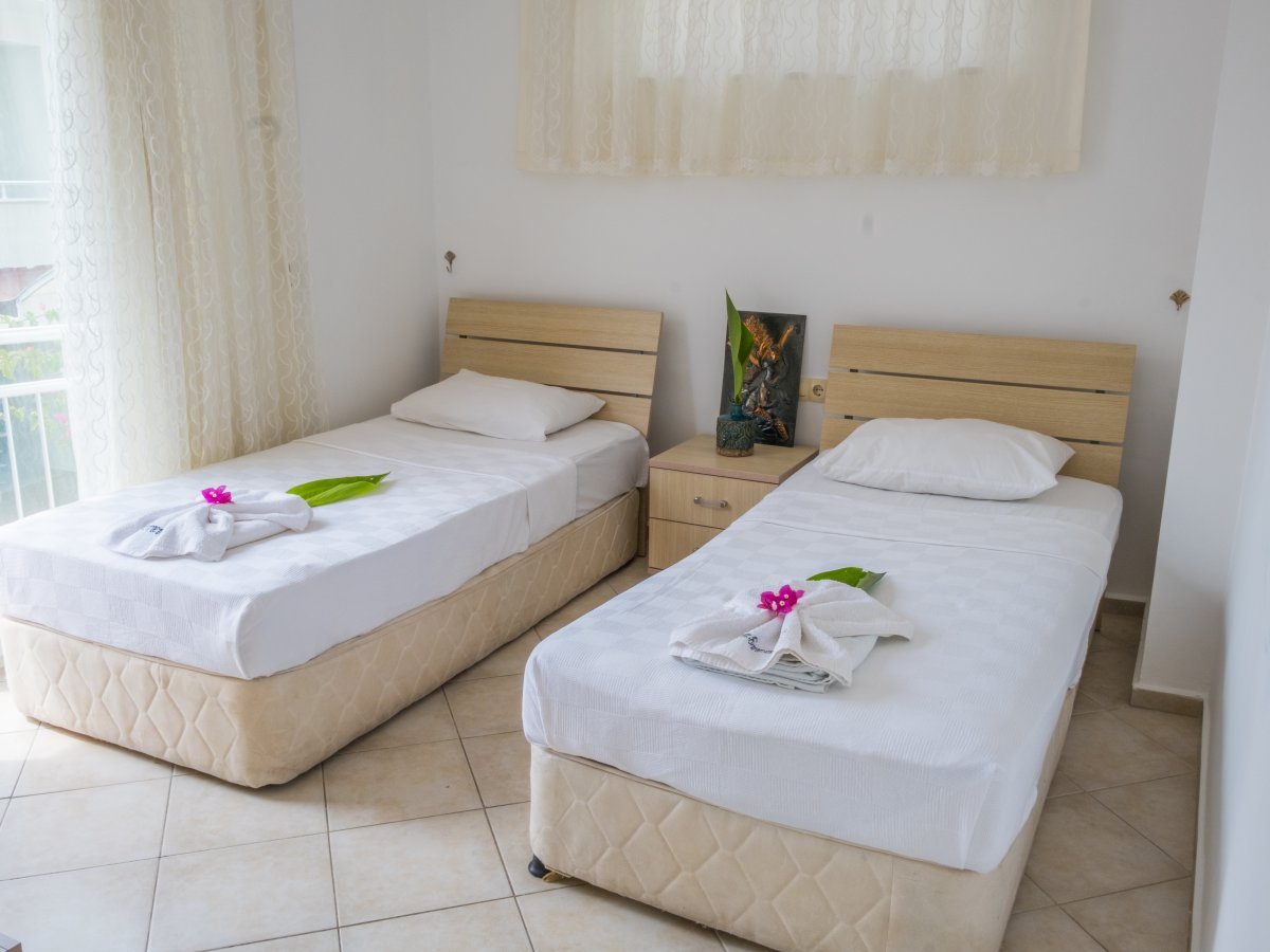 It is very easy to rent apartments in Fethiye when you choose us.Holiday villas owned by our company have one of the best locations in Fethiye. There are 2 bedrooms on the first floor of this apartment, whose photos can be viewed on our website. There is also a specially designed kitchen, balcony and bathroom.