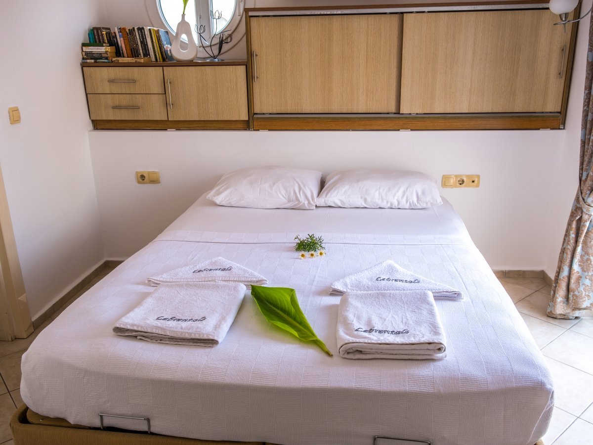 The apartment has a double bed and a large balcony on the top floor.