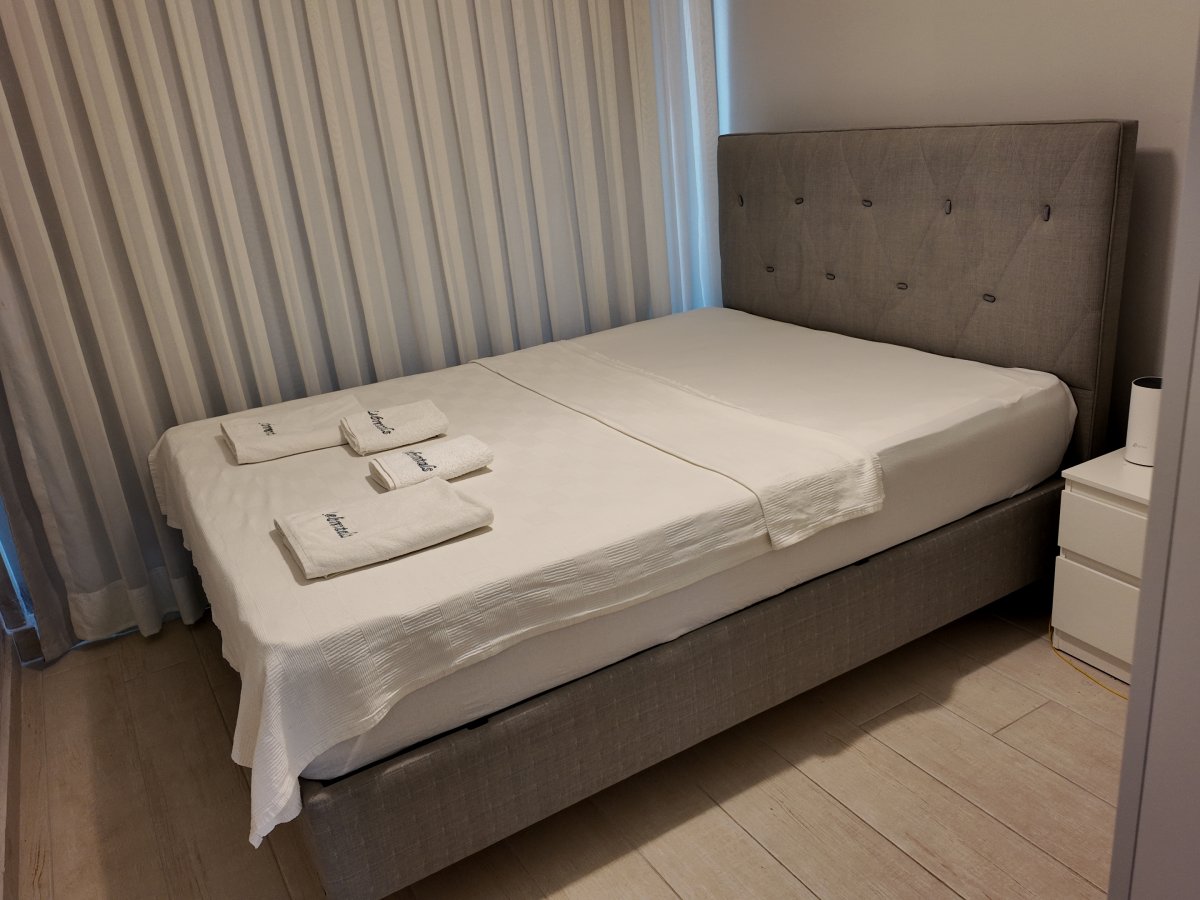 Bedroom has one large double bed and French balcony. Bathroom of the apartment is located between living room and bedroom.